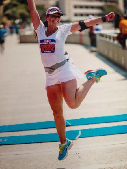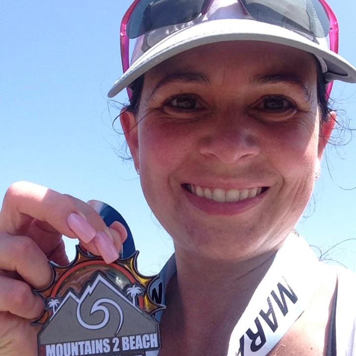 At the end of May, I flew to Santa Barbara and drove into Ventura to run Mountains 2 Beach.  My chiropractor believed in me.  She said I was ready.  So off I went.  Running down a hill from Ojai to Ventura is quite a ride!   That course has some very beautiful spots along the way.  Still, at mile 18 I began to feel the hip and the lower back and my average mile time began to creep up.  I decided to just have fun and when I crossed that finish line with a 4:35 finish, I managed to do a jump and the photographer caught me as I was coming back down.  My motto – Always have fun!  I finished that race and have a beautiful medal to show for it.  I was alone on the course that day.  But there were followers from my Facebook community page, I RUN California,  who saw me and yelled out to me either during the race or after the race.  These were the words that I needed at the time to help me press on and keep my head high.  My phone exploded with well wishes and congratulatory posts.  Friends, even when not present, mean more than finish times.