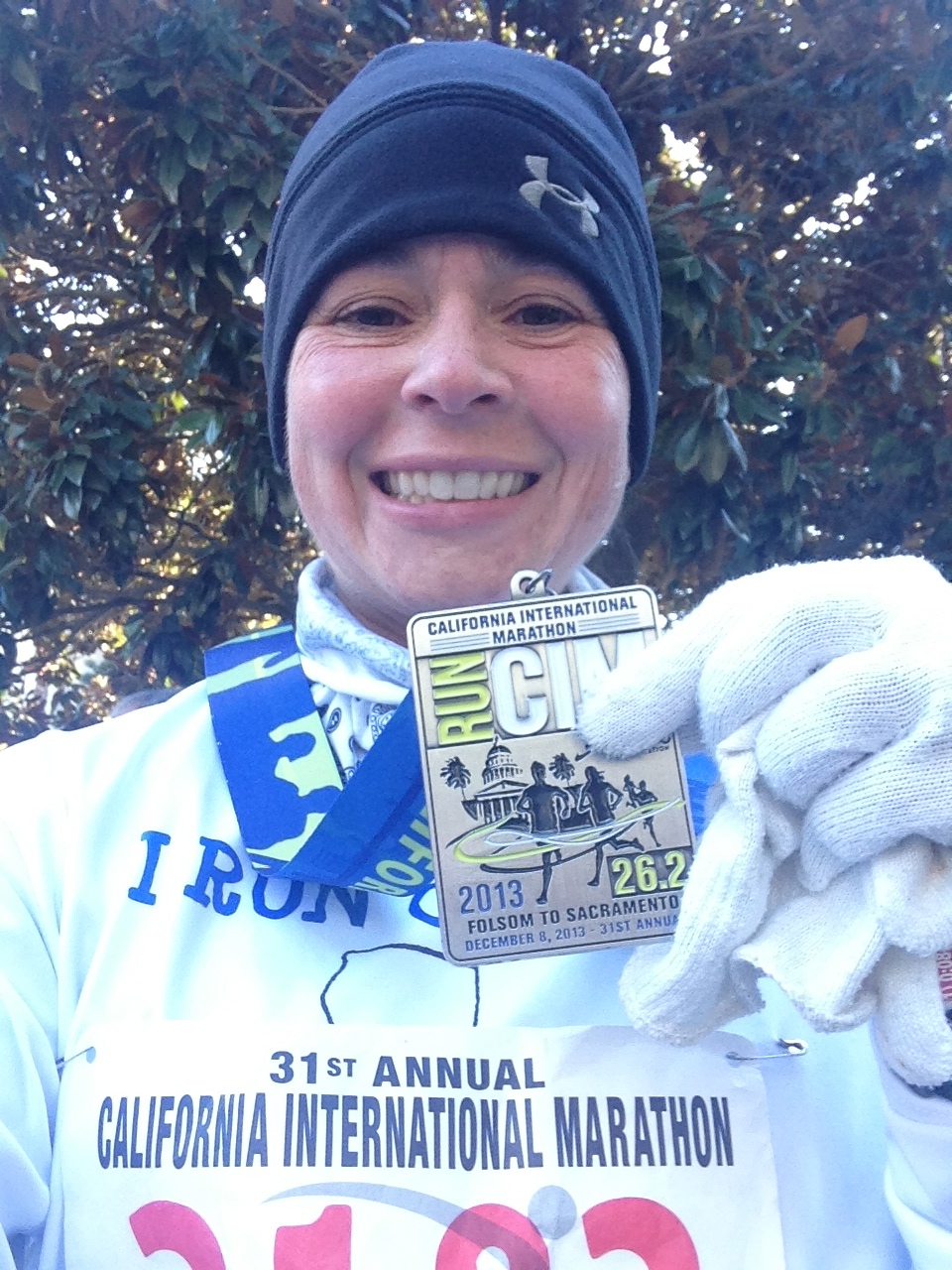 At mile 23, I hit a water stop and then it hit me.  My hip was aching from the weight of my hydration bottle on my lower back.  My friend Jackie had ran her leg of the relay, got to the finish line and was walking the course backward looking for me.  She knew something was not right when she passed the 3:55 group and could not find me.  She knew that when they finished and I was not with them, that there was something wrong.  She came looking for me.  As if we were twins, I sensed her.  I looked to my right and there she was, running out to me with this look on her face – a look of worry and concern.  Her presence at that moment was more than I could ever wish for.  Jackie ran me in for the remaining 3 miles.  We talked and passed the time.  Jackie shared with me that our mutual friend, Michael from Run Nerds Rock, ran 11:11 miles 8:58 pace just for me.  Anyone who knows me knows my relationship with 11:11.  He could not get me the message, but wanted to make sure that she gave it to me when I finished.  That message gave me a perk in those last miles and my pace began to come back up.  Jackie entertained me and talked to me.  It was Jackie who helped me finish this race.  I cried when I finished CIM because I felt that I had let so many people down.  I knew my training was there.  I knew I could do this race and finish the way I intended.  I have a friend who is instrumental in delivering the movie, Spirit of the Marathon and Spirit of the Marathon II. She was sending me messages prior to CIM filled with inspiration and guidance.  I felt that I let her down.  I felt I let my family down.  I felt that I let all these people down, BUT I did not feel that I let myself down. I suppose this is key, here.  I felt discouraged, frustrated and really angry that I did not run MY race.  I know what I am capable of and I did not deliver.  I guess that is a good thing that I did not let myself down.  Because if I lost hope in me, then where would I be?  As I crossed that finish line – the final one for 2014, I had a new PR for the year.  I finished CIM in 4:26.  I missed all my goals, but I created a new one with Jackie by my side.   I would PR for the year. As I gathered my medal and came through the chute, I saw two of my friends and Jackie coming up to meet me.   I broke down in tears and realized then that friendships are worth more than finish lines.